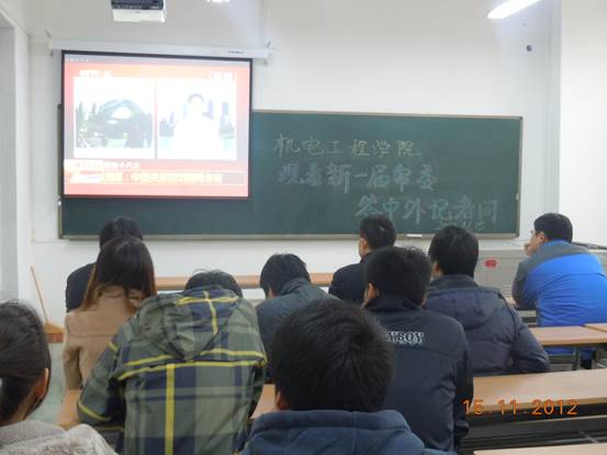 2012年11月15日上午,足球赌注网站组织师生在4B-401观看了新一届中央政治局常委新闻媒体见面会。公司的党委书记赵玉厚、副经理刘波、赫东锋、系主任张长富、实验中心万宏强和公司部分员工党员观看了整个直播。
