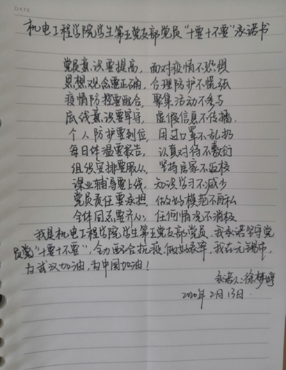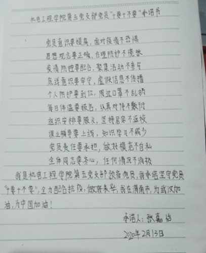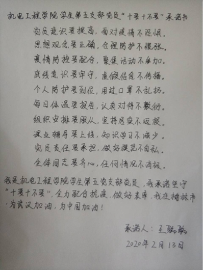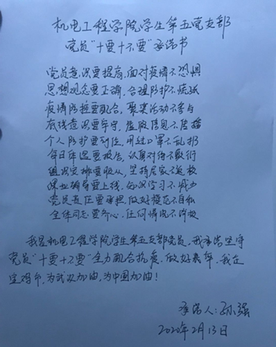 支部书记黄彦军、支委会成员王聪聪和党员代表张嘉怡共同拟定了足球赌注网站员工第五党支部党员“十要十不要”承诺书。王聪聪同志代表支部全体党员宣读足球赌注网站员工第五党支部防范疫情“十要十不要”承诺书。全体党员手写承诺书并签字。
