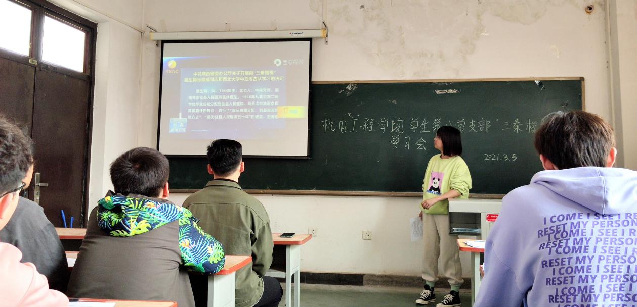 会议伊始,栗宇翔同志为党支部成员通读三秦楷模“路生梅、张雷威、西北大学中亚考古队”的先进事迹,紧接其后,支部书记张晓君同志通过视频讲解使支部成员更加深入学习三秦楷模的模范事迹,学习他们的舍身忘我,矢志风险的崇高境界,学习他们恪尽职守、埋头苦干的朴实作风,学习他们勇于担当、冲锋在前的拼搏精神。