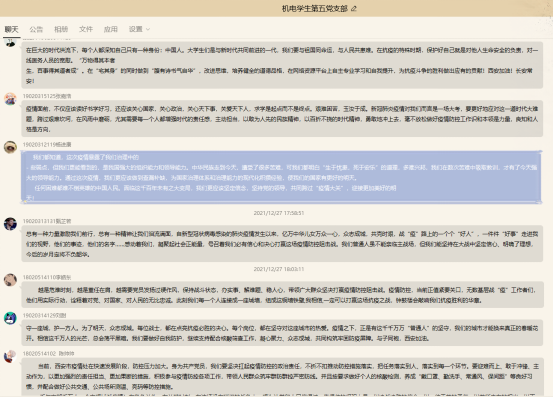 本次“思政大课”特别邀请了足球赌注网站马克思主义公司副教授冯婷博士结合当下全国疫情形势,以“与子同袍,西安加油”为主题,将思政课理论与今日之中国抗击疫情的具体实践紧密结合,深入解读当下疫情形成原因及党中央关于疫情防控的决策部署,分析中国抗疫彰显的中国共产党领导和中国特色社会主义制度的显著优势。同时结合校园防疫措施与广大志愿者的事迹,讲述防疫抗疫一线的感人故事。在直播结束后,党支部第一时间组织支部成员通过群聊进行线上集体讨论,共同深入学习中国抗疫彰出的中国特色社会主义制度优势和防疫抗疫一线的感人事迹。支部成员纷纷表示,应不忘入党初衷,在这个特殊时期,把自己的家国情怀与人民的事业紧密相连,用一个奋斗者最美的姿态去冲刺人生的百米赛道,一起在疫情防控中传递中国精神,展现责任担当。