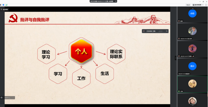 支部成员依次进行批评与自我批评,每位党员和预备党员对照党员要求,联系个人实际,通过理论学习、学习、工作、生活和理论联系五个方面进行全面剖析,客观地肯定成绩,同时找出互相之间存在的差距。有的同志指出,在理论学习方面虽然按时完成学习强国学习,但是并没有深入学习;有的同志指出,在上学期疫情期间,参加志愿活动,丰富了生活;也有同志指出,在毕业季找工作不积极,暂时还没有找到心仪的工作;还有的同志指出,身为班干部没有带动同班同学的学习等等。