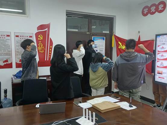 在汇报完毕后,杨丽丽同志代表支委会向全体成员报备四位发展对象的基本情况,经全体与会成员对四位发展对象充分讨论后,支部同意接收陶睿祺、敬烨、李一乔、党晓航四位同志为中共预备党员,并由杨丽丽同志带领宣誓。