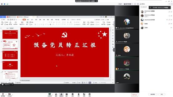 根据大会议程,首先由预备党员李林蔚同志介绍其在预备期一年内的思想学习情况,李林蔚同志从对党的认识、入党动机、自身学习、志愿服务、竞赛、考研等方面进行汇报。之后由雒嘉豪同志作为其入党介绍人汇报李林蔚同志在预备期内的基本情况,着重强调了李林蔚同志在疫情防控期间,主动作为申请作为志愿者投入到防疫工作中,并且号召全宿舍成员一起参与到防疫工作中,为公司的防疫工作贡献自己的一份力量,同时也将这种精神传递给了周围的同学。经过全体与会人员根据预备党员的自我陈述和入党介绍人的陈述进行投票,由杨丽丽同志代表支部做出决议,同意李林蔚同志按期转正,支部同意接收李林蔚同志为正式党员。