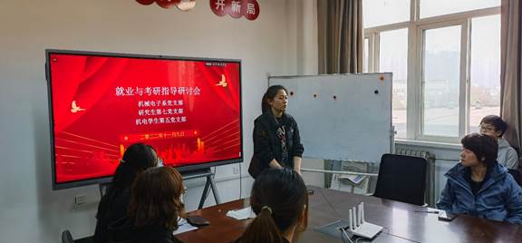 为做好2023届毕业生考研与就业指导工作,强化党建引领促就业,引导员工构建正确的就业观、考研观及发展观,发挥员工党支部和员工党员示范引领作用。2022年11月9日,机械电子系党支部、研究生第七党支部和机电员工第五党支部联合举办了就业与考研指导研讨会。会议由员工第五党支部书记王晶同志主持,各支部在校同志、机械电子系专业负责人王丽老师参加本次研讨会。