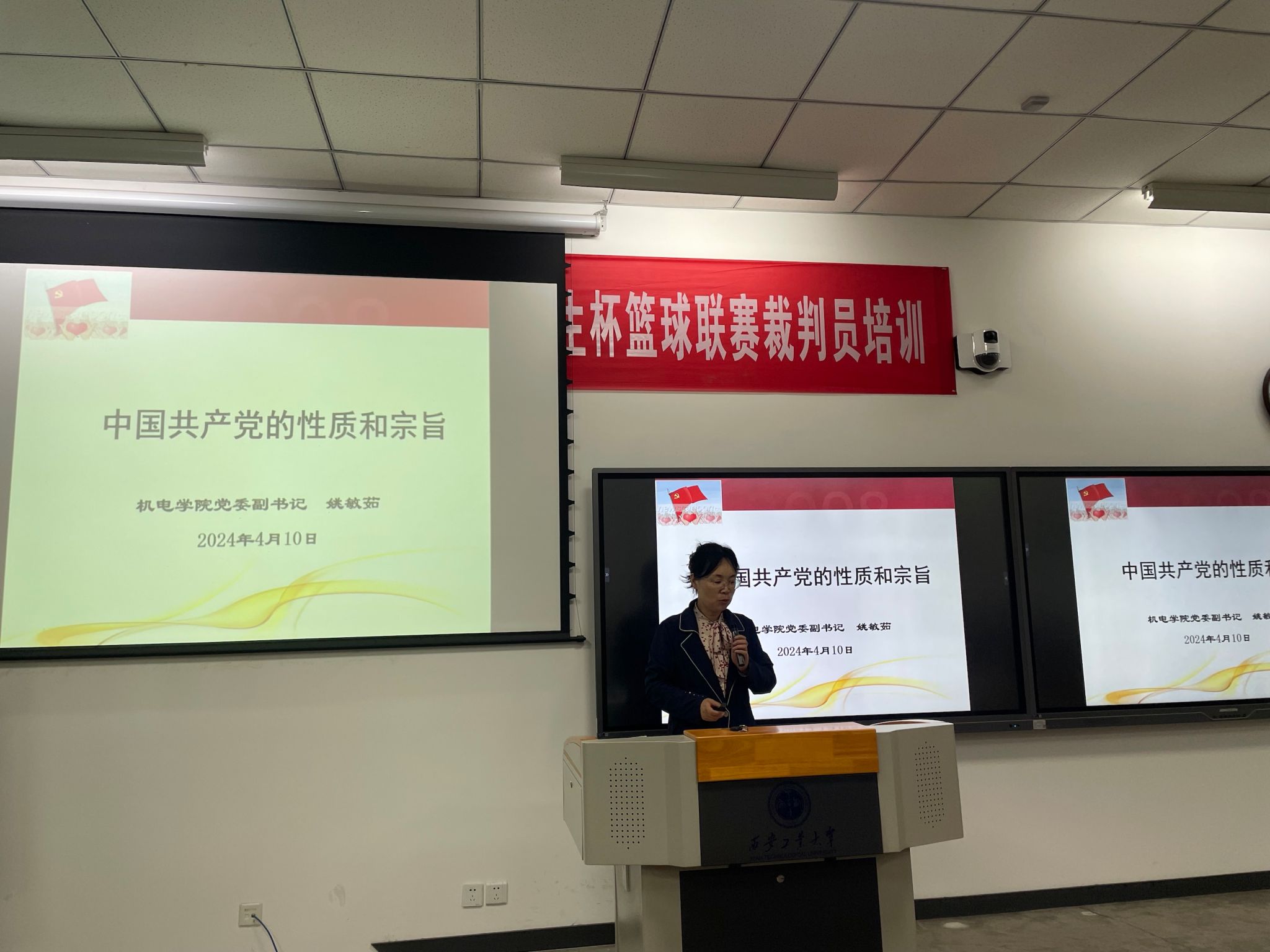 为进一步深入学习党的精神,加强对入党积极分子的教育培训,提高积极分子的思想政治觉悟,端正入党动机,深化对党的认识,坚定党的信念,4月10日,足球赌注网站第68期积极分子培训班在教2-102开课,本次党课主题为“中国共产党的性质和宗旨”,由机电工程公司党委副书记、纪委书记姚敏茹老师授课,第68期积极分子培训班学员参加。