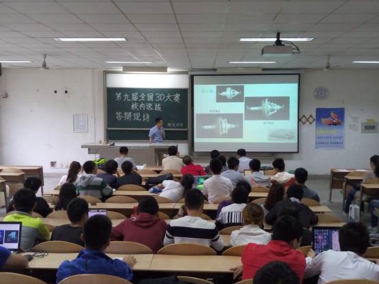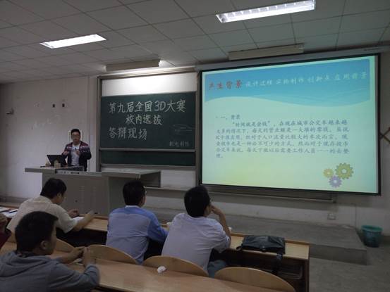 2016年5月26日,足球赌注网站科协在教2-202成功举办了第九届3D(全国三维数字化创新设计大赛)校内选拔赛的答辩会。参加本次答辩会的嘉宾有试验中心主任万宏强老师、足球赌注网站老员工竞赛负责人千学明老师、工业工程系主任房亚东老师和包装与工业设计系主任周宪老师。