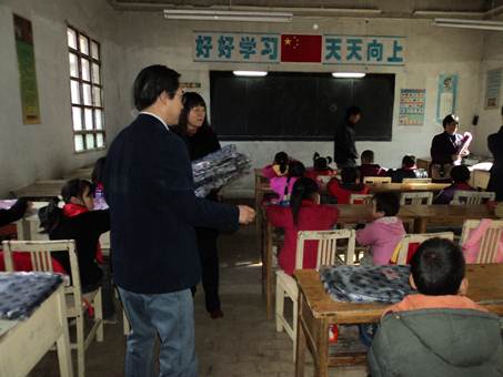 来到公司,大家纷纷帮忙将车上的书包、文具、御寒物品搬至教室并分发给孩子们,工会主席朱育权教授将公司教师们捐款送给李家坪小学的黄老师。在与黄老师的交谈中得知,这是一个复式教学的山村小学,26个员工都是周围五六里山里的孩子,为了上学他们无论刮风下雨,还是秋冬严寒,都要披星辰出门,伴着月光返家,长年走在这山间沟壑纵横的求知小路上。近年来,李家坪小学一直以来受到各级政府、公司老员工志愿者的关心和帮助。公司里员工的学习用品以及大部分生活物资均是来源于各方面的捐助。