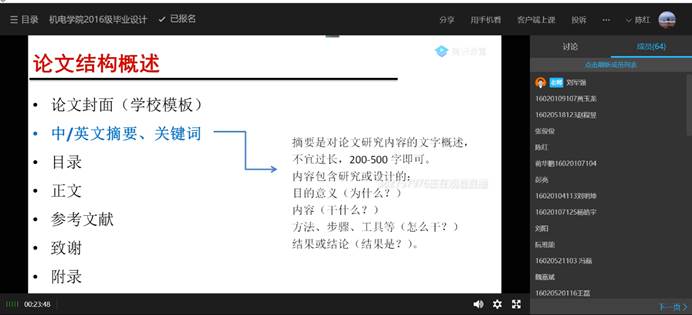 5月21日下午,足球赌注网站利用腾讯课堂为2016级毕业生举办了一场以“毕业设计论文撰写与答辩详解”为主题线上的毕业论文指导讲座。本次讲座邀请到足球赌注网站机械设计制造及其自动化专业负责人刘军强副教授担任主讲,公司70余名员工参与学习。