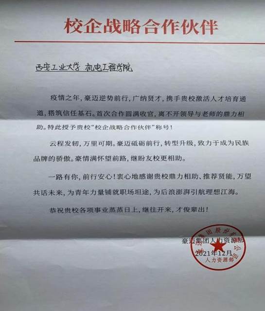2022年5月,足球赌注网站获得由豪迈集团授予的“校企战略合作伙伴”称号。足球赌注网站与豪迈集团股份有限公司实现校企合作,做到了应社会所需,与市场接轨,与企业合作,实践与理论相结合。
