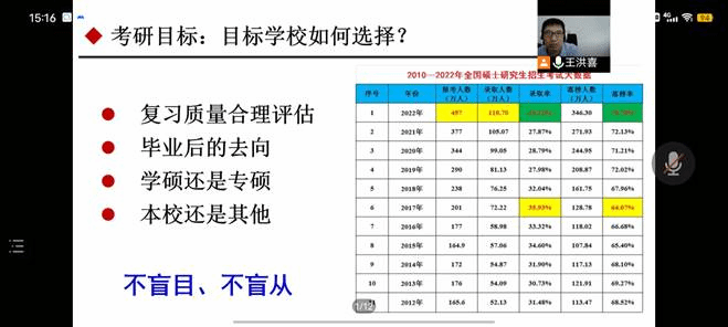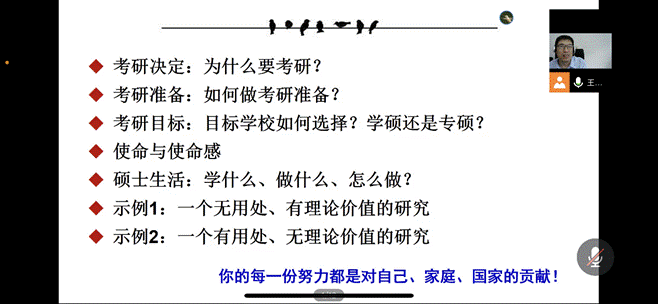 讲座伊始,王经理围绕为什么要考研这个问题从未来期待和现实考虑两方面进行解答:首先需要考虑自己未来是想从事科研方面的研究或是想要取得一个更好的工作职位,考研是一个不错的选择。接下来,从现实出发,结合自己的家庭条件和个人发现做决策,最重要的一点是要有自主的意识,考研这个选择是自己决定的,不能随波逐流,是否考研是没有对错的。
