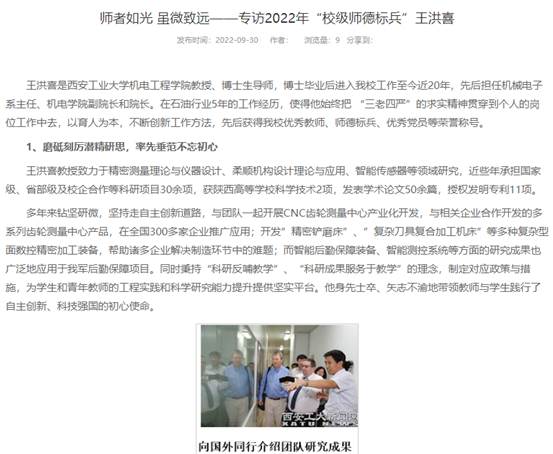 运用机电教工党员之家、员工作群、公司网站等平台,线上线下结合,加大对师德师风标兵、优秀教师、优秀共产党员先进事迹的宣传弘扬。目前已完成一期《师者如光虽微致远——专访2022年“校级师德标兵”王洪喜》。