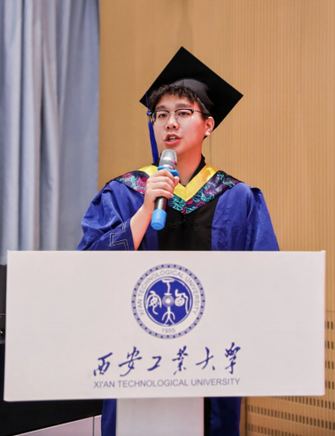 毕业生代表李悦上台发言,深情回顾了在西安工大的求学历程:从怀揣军工梦想踏入“兵工七子”学府,到在公司严谨学风和导师悉心指导下深耕机械领域,发表多篇学术论文,参与军工企业横向课题,将传动分析、故障诊断等实验室理论转化为解决工程现场问题的能力,实现了从员工到准工程师的蜕变。他特别感恩公司提供的产学研融合平台,使他在攻克科研问题的过程中锤炼了“精工博艺”的匠心,更通过员工工作深化了责任担当意识。