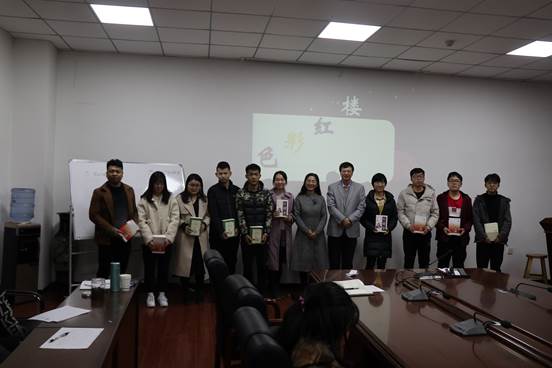 讲座伊始,王老师对马博士进行介绍,并宣布讲座正式开始。首先,马博士感谢在场各位的到来,以自身读《红楼梦》“千遍”的经验将各位引入本次讲座中,并表示接下来会在理科的思维上以“色彩”展开本次活动。接着,马博士通过介绍红楼梦序章,站在两位线索人物的角度成功将在场各位带入红楼的世界里。以“红色—金色—黑白”为主线介绍了红楼梦作为四大名著之一的原因,不仅是因其文字语言魅力,更是因其所包含的人文历史、文化魅力,书中人物的衣着、美食、风俗文化等,让老师与同学们对红楼梦有了更清晰的认知。同时马博士也对红楼梦里阐述的部分内容与现代科学相结合,由古论今,两相结合,为大家带来极为精彩的文学盛宴。讲座临近尾声,路书记对马博士所讲内容表示感谢并希望在座的各位同学可以认真理解今天的内容。活动最后,由王老师主持并由马博士和路书记抽取了数名“幸运儿”,他们获得了本次活动的精美礼品——全套红楼梦小说,本次活动由此圆满落幕。