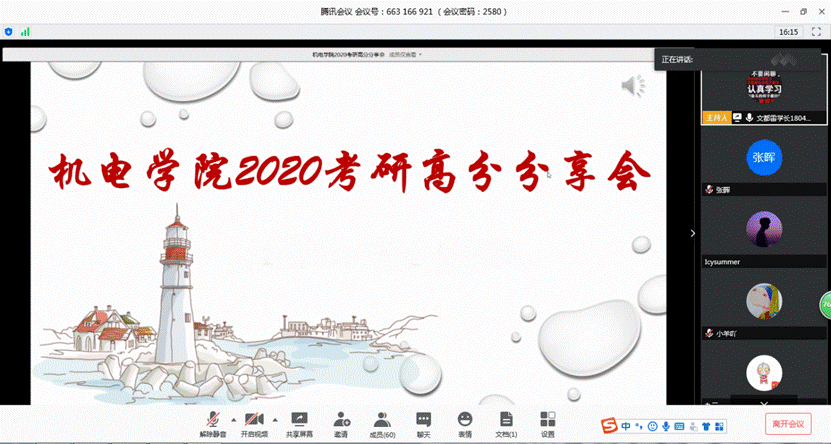 4月17日晚上19:00,2020届考研高分分享交流会在腾讯会议中进行。参加本次会议的有张晖和薛鹏两位老师,特邀请2016级的今年考研高分的四位同学和部分研究生做考研经验分享,还有80余名大三、大二的同学聆听了本次大会。