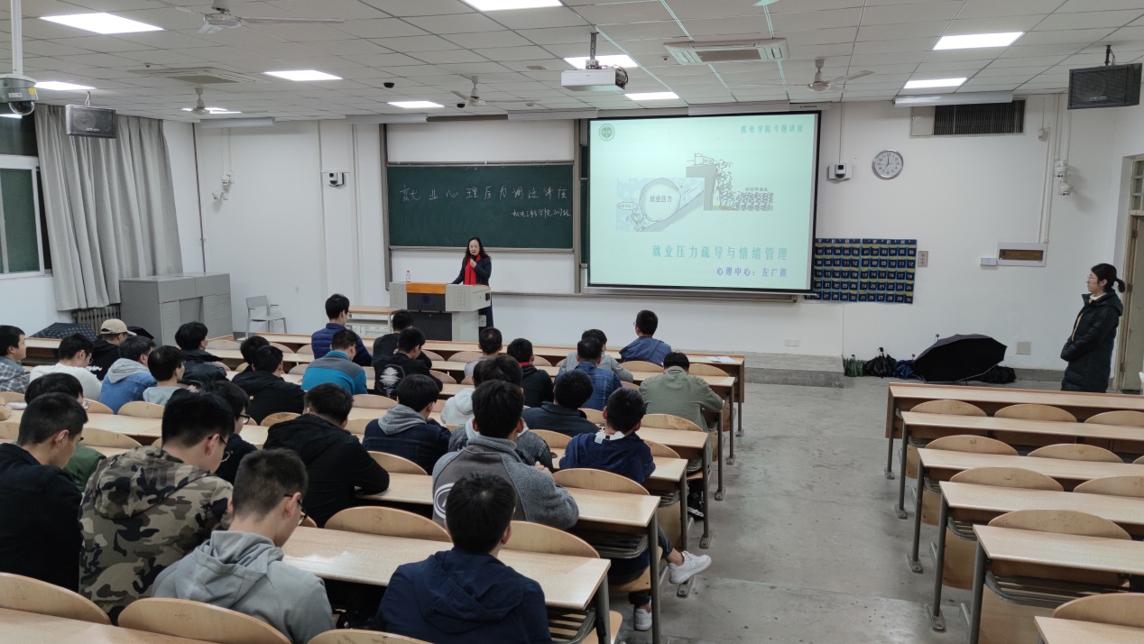 11月17日下午,由公司心理发展指导中心、足球赌注网站共同举办的就业心理压力调适讲座在教1-102顺利举行,本次讲座由公司心理中心左广霞老师主讲,2017级毕业班部分同学聆听讲座。