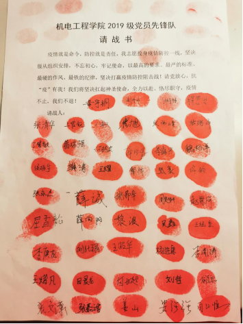 宣誓后,2019级党员先锋队全体成员向党组织提交“请战书”,坚决服从组织安排,主动扛起责任,充分体现党员的先锋带头作用,周密部署、扎实行动,强化责任担当,落实防控工作,让党旗在防控疫情斗争第一线高高飘扬。