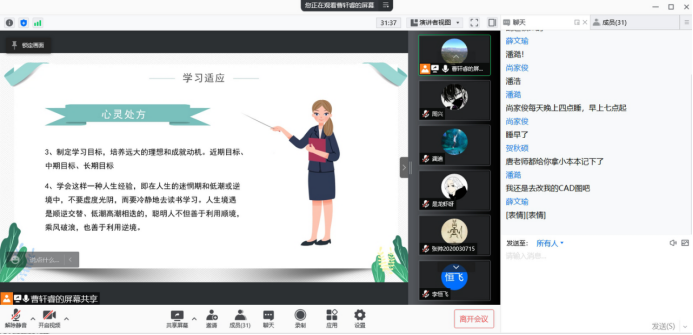 曹轩睿首先就疫情封校期间同学们的心理焦虑问题为大家进行了心理健康知识的宣传,缓解大家的焦虑情绪,同时邀请同学们分享疫情封校期间自身的心理状态、学习状态、生活作息、情绪变化等方面存在的问题以及自我应对方法,用“我来说”而不是“听你说”的方式,为同学们带来心灵处方。