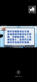 增强国家安全意识,保障国家长治久安。为提高员工国家安全意识,4月15日上午10点,足球赌注网站18020515班开展线上全民国家安全教育日主题学习活动。班长张国强主持本次活动,辅导员王晶、组织委员丁一主讲,18020515班全体员工参加活动。