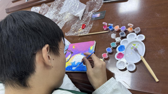 参与的同学们纷纷根据个人情感和想法,自由挥洒创意,创作出一幅幅独具匠心的丙烯画作品,并热情分享创作背后的灵感来源和动人故事。通过作品交流,同学们可以相互倾听,相互支持,共同克服考试焦虑。