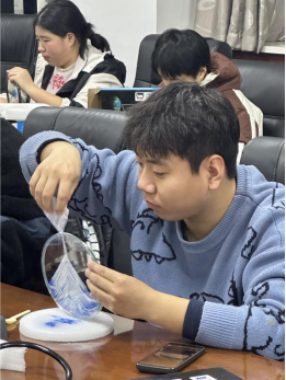 参与同学们使用透明亚克力立体画框、彩色流沙及矿物颗粒,通过分层填充、注液融合等步骤,创作出动态山水、星空等主题的3D流沙画。沙粒在重力作用下自然流动,形成千变万化的立体景观,员工在专注创作中体验“心流”状态,暂离现实压力。