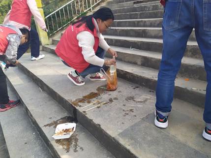 上午9点30分,志愿者们在图书馆门口集结完毕。在短暂的车马劳顿后,抵达本次志愿活动的地点-灞河。本次的志愿活动主要为捡垃圾,志愿者们沿灞河河岸寻找并拾取每一个垃圾。有的餐盒被随意扔置在台阶上,有的垃圾袋上粘满了油污,志愿者们伸出双手尽责将垃圾袋捡起。草丛里、台阶上、道路旁,每一处都有志愿者们寻找垃圾的身影。大到塑料袋,小到一颗烟蒂,没有垃圾可以躲过志愿者们的“火眼金睛”。路过的环卫工人表达了对志愿者们工作的肯定和赞扬,亲切的为志愿者们提供了垃圾袋,并一再告诫志愿者们捡垃圾时要小心,之后更是让志愿者们亲身体验了打捞河里垃圾,利用各种工具,顺利完成任务。告别环卫工人后,志愿者们合影留念,于十一点踏上归途。